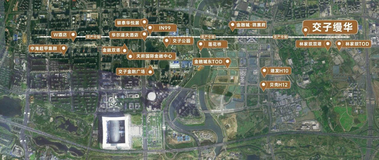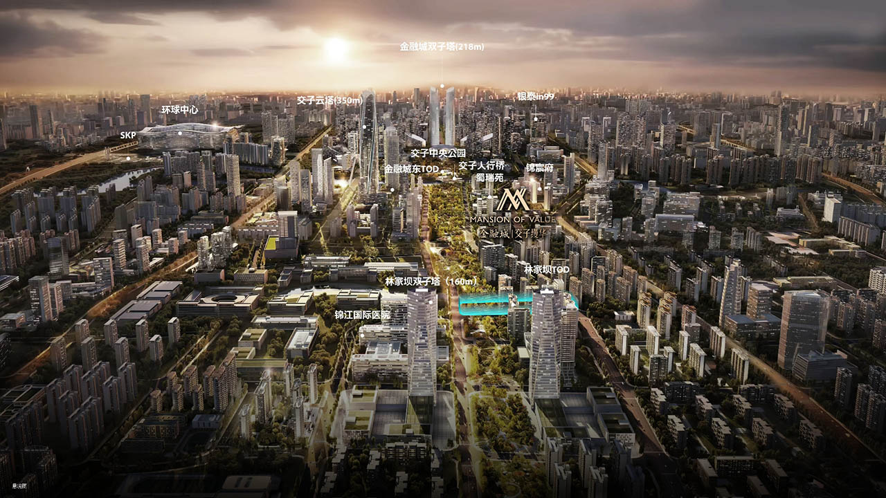 矗立于金融城东、无界交子绿廊,约500米直抵交子公园,紧邻林家坝TOD,这与国际顶壕的站位一脉相承:金融中轴之上、中央公园之畔,在城市的经济心脏,不仅有城市中心金融城,还近享金融城楼市未来的最后一块“价值区域”。